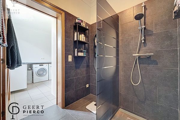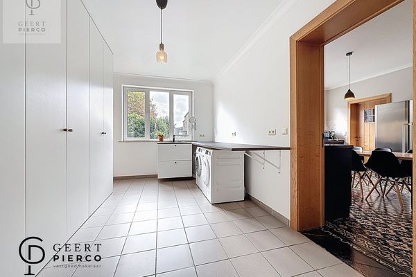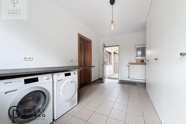 Aansluitend bevindt zich een bijzonder ruime bijkeuken, uitgerust met ingebouwde kasten, plaats voor was- en droogmachine én een extra doucheruimte.