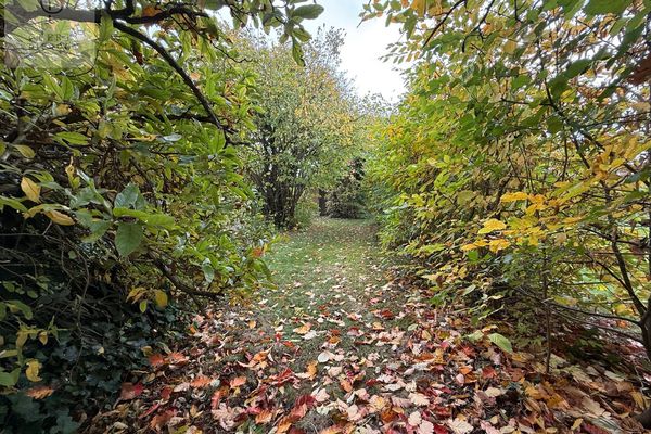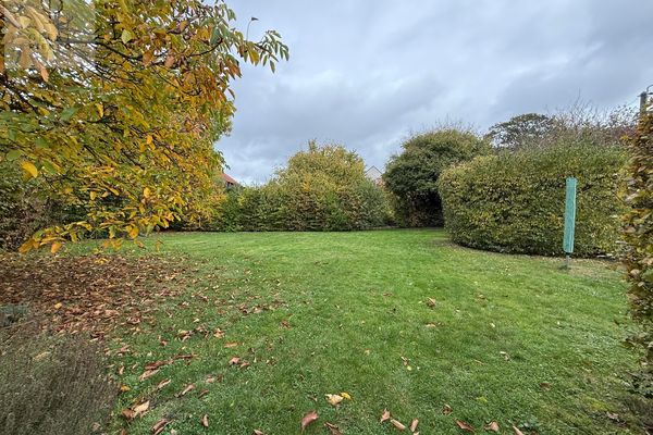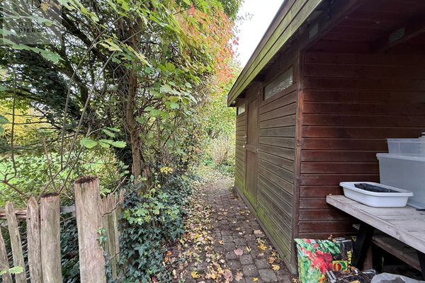 De tuin is een oase van groen, met een verzorgde aanplanting en een aparte, losstaande garage naast de woning.