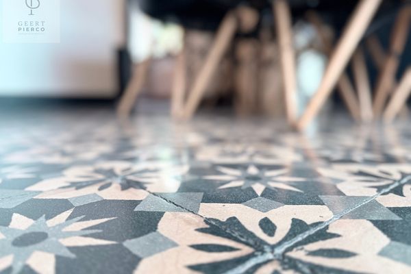 De mooie betontegels op de vloer zorgen voor karakter en continuïteit, terwijl de grote koel- en vrieskasten en de moderne toestellen het geheel praktisch en hedendaags maken.