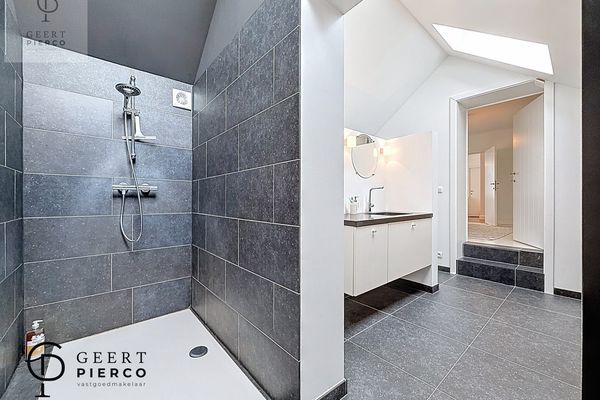 De badkamer is ontworpen als een plek van rust, met een royale inloopdouche in natuursteenlook, modern kraanwerk en zachte lichtinval via de dakramen.