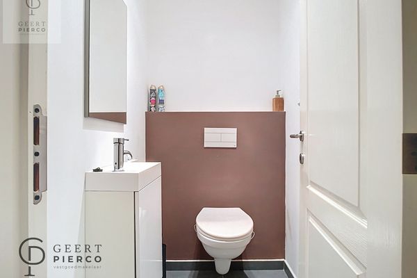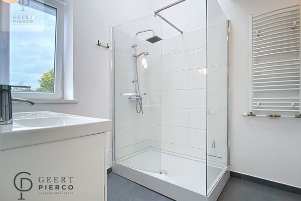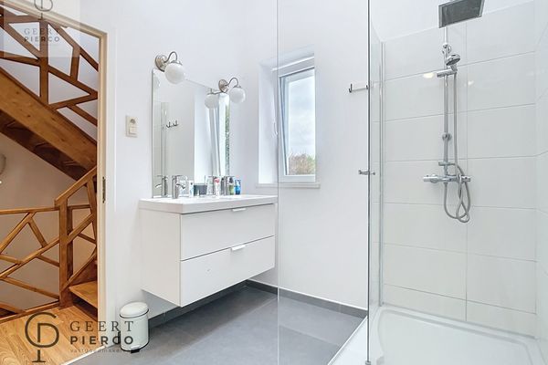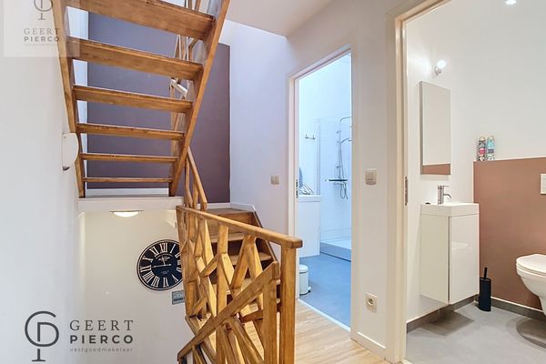 Op de eerste verdieping vinden we de badkamer, het toilet en een slaapkamer terug. De slaapkamer kan eveneens gebruikt worden als bureel of als knusse zitplaats.