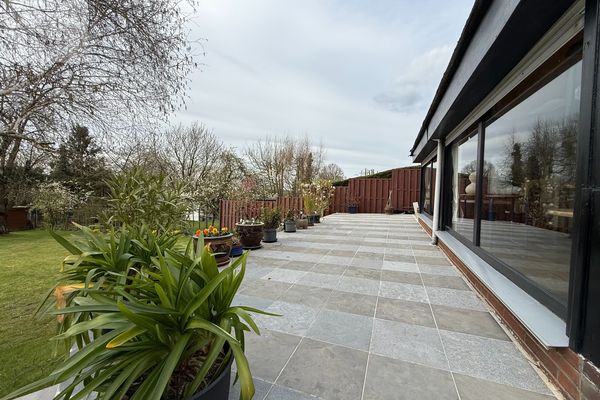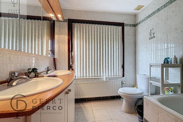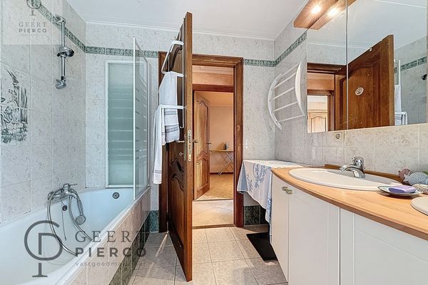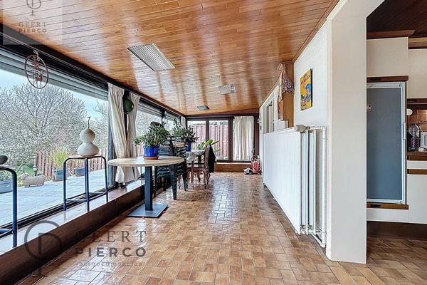 Vanuit de veranda stappen we zo het ruime terras op, met aansluitend de grote tuin waar je in alle rust kan genieten van het groene uitzicht.