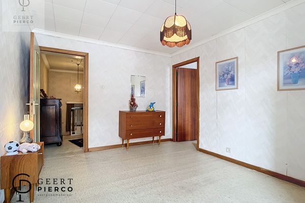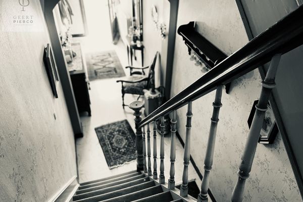 Hier kunnen we ofwel doorsteken naar achterzijde van deze woning, de trap nemen of meteen rechts gaan, de leefruimte in.