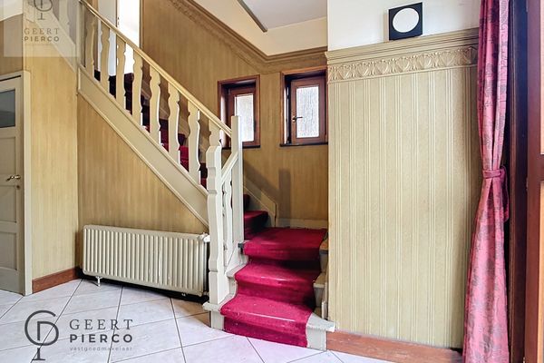 Via de voordeur, begeven we ons naar de hal, die meteen toegang geeft tot de leefruimte, toilet en trap naar boven.