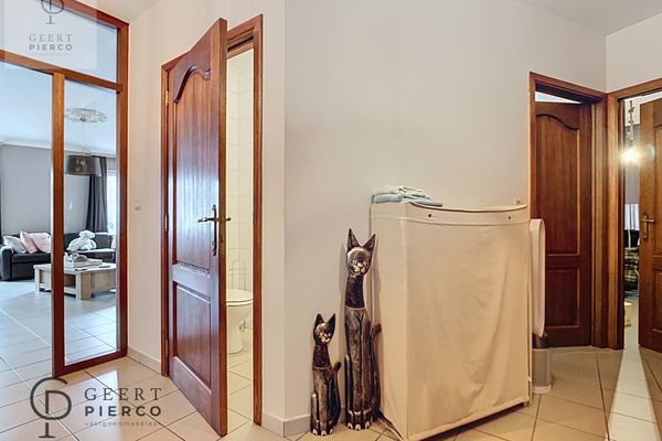 Via de inkomhal begeven we ons naar het gastentoilet, de wasplaats, de douchekamer en de twee slaapkamers. Via de woonkamer betreden we de grootste slaapkamer met aan sluitend de badkamer.