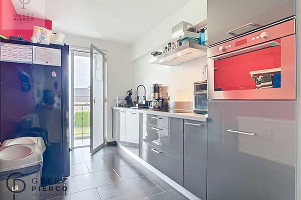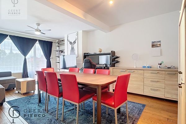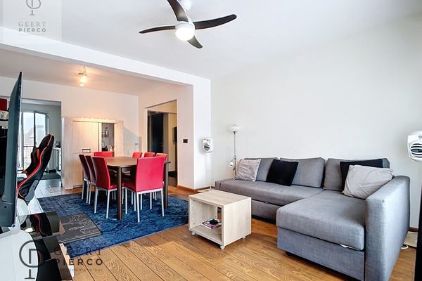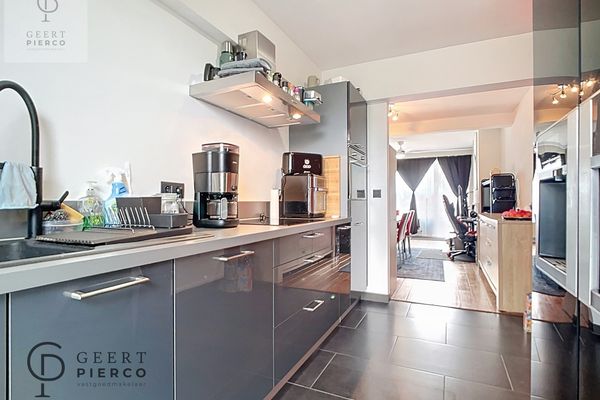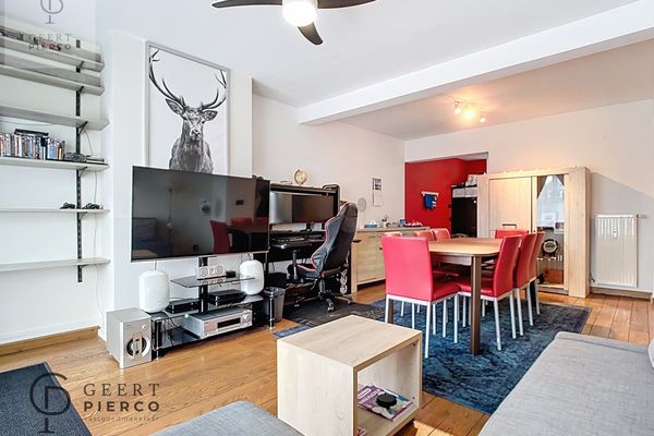 Een leuke leefruimte, combinatie parket en zwarte tegel springen meteen in het oog. Je vindt er twee gezellige slaapkamers, badkamer, apart toilet. De leefruimte, ook vooraan met terras, geeft meteen toegang tot een open keuken, die volledig en modern werd ingericht. Ook hier heb je toegang tot een terras.