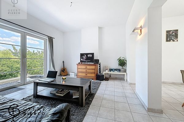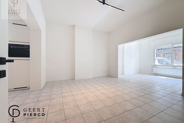Dit gelijkvloers appartement heeft een ruime zit- en leefruimte met open keuken.