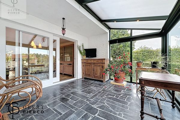 Aansluitend vinden we de eetruimte, die rechtstreeks overloopt in de veranda met uitzicht op de tuin. Deze lichte ruimte vormt een verlenging van de eetkamer en is de ideale plek om te genieten van een boek of een koffietje met zicht op het groen.