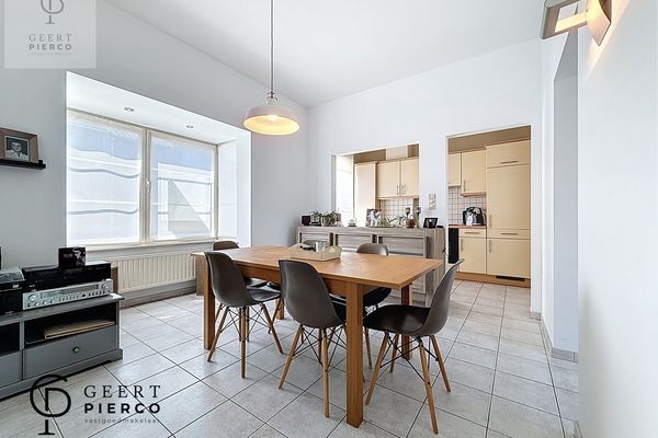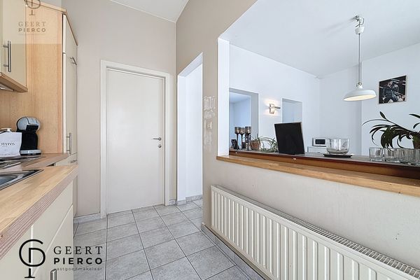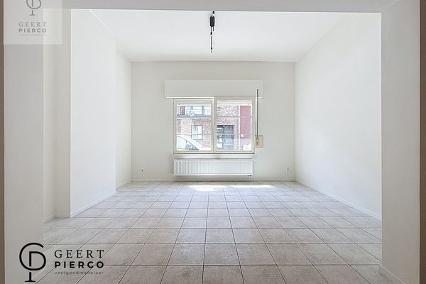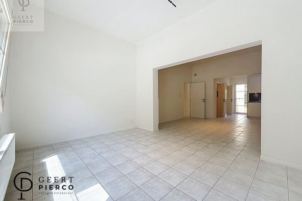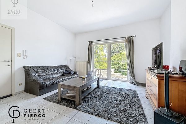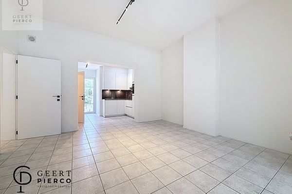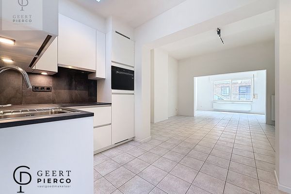 Dit gelijkvloers appartement heeft een ruime zit- en leefruimte met open keuken.