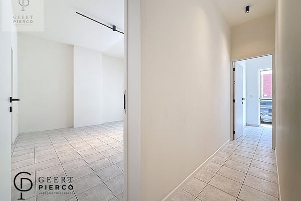 Achter deze deur krijgen we via een inkomhal toegang tot het gelijkvloers appartement met buitentuin.