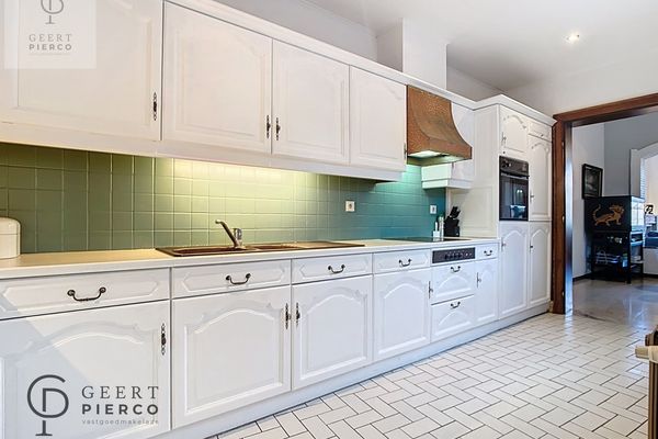 Via de eetkamer stappen we verder naar de ruime keuken, waar overvloedig daglicht binnenvalt dankzij de aanpalende veranda.