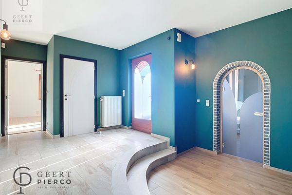 Via het beklinkerde tuinpad begeven we ons naar de centrale inkomhal van deze mooie bungalow. De inkomhal met gastentoilet geeft doorgang tot alle woon- en slaapvertrekken.