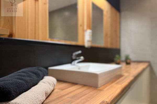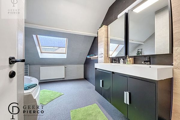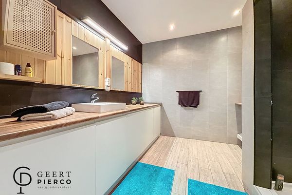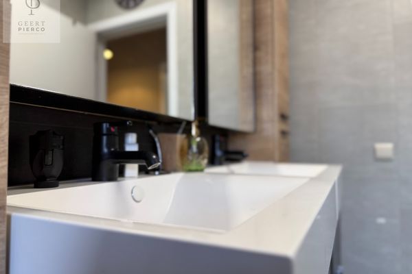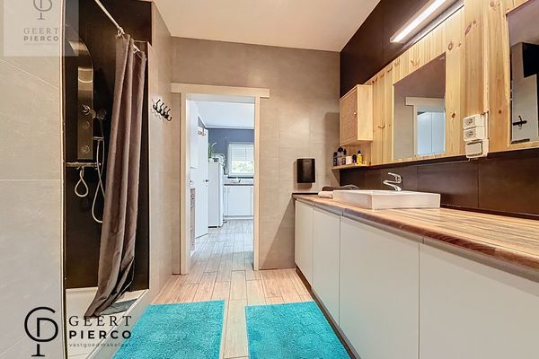 Vanuit deze berging hebben we niet alleen toegang tot de ruime veranda, maar verkennen we eerst verder het gelijkvloers. Naast de berging bevindt zich een eerste badkamer met dubbele lavabo en douche.