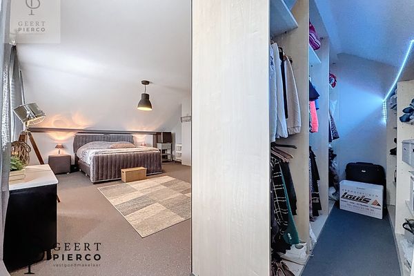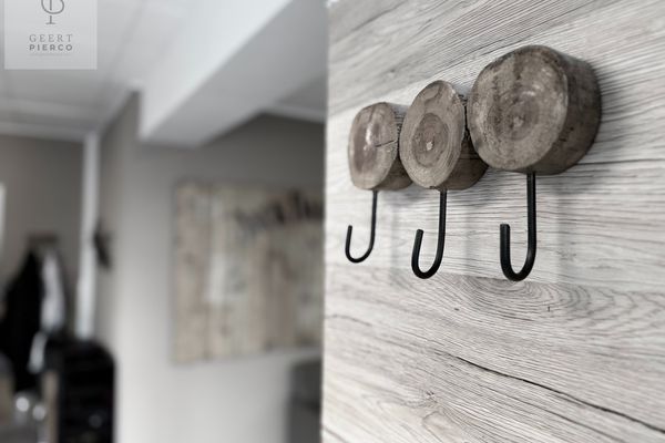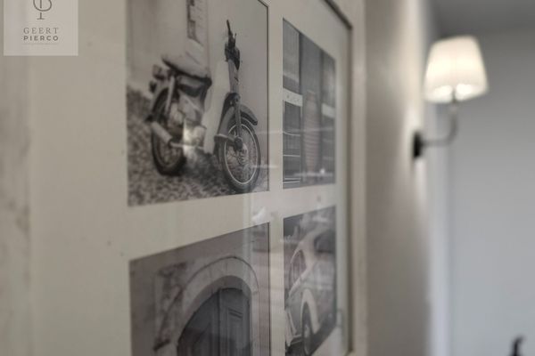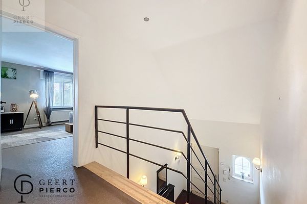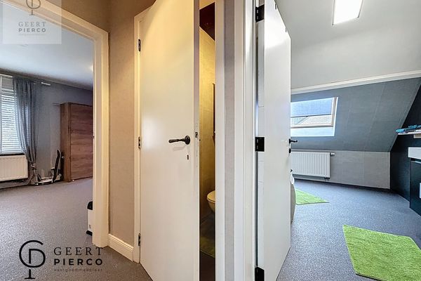 Daarnaast is er ook een doorgang naar het kapsalon, dat op zijn beurt opnieuw uitgeeft op de inkomhal. Het gelijkvloers is volledig circulair, wat zorgt voor een bijzonder vlotte indeling en gebruiksgemak.