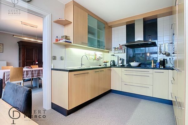 Aansluitend op de leefruimte wandelen we naar de super gezellige keuken, die voorzien is van alle moderne toestellen. Voor de echte koks is dit het van het, want ook hier blijf je genieten van de leuke tuin en is de lichtinval enorm.