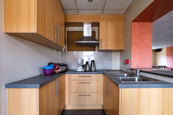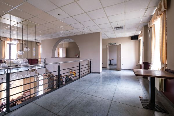 Ook deze zaal met volledig ingerichte toog en industriële keuken staat te wachten op een volgende gelegenheid.