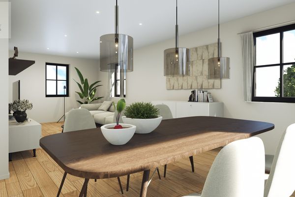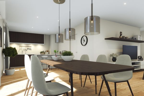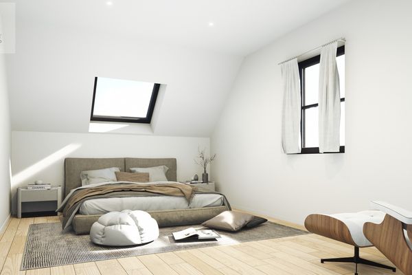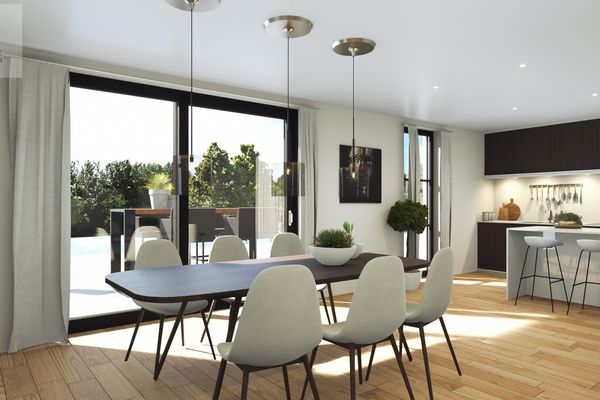 De zithoek, eetruimte en open keuken vloeien harmonieus in elkaar over en bieden toegang tot een zonnig dakterras van bijna 20 m² – perfect om te genieten van rust en openheid.