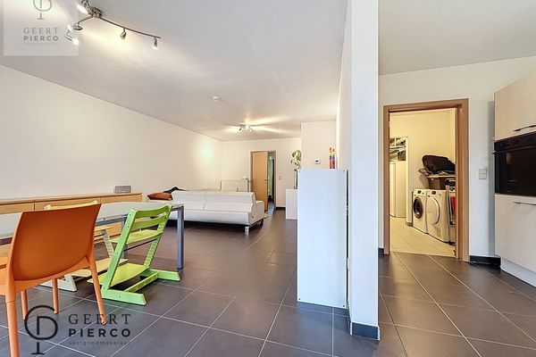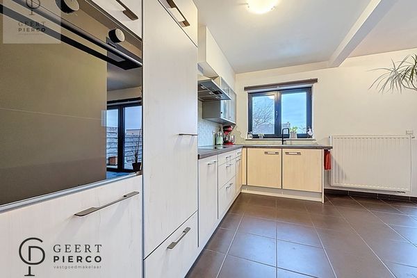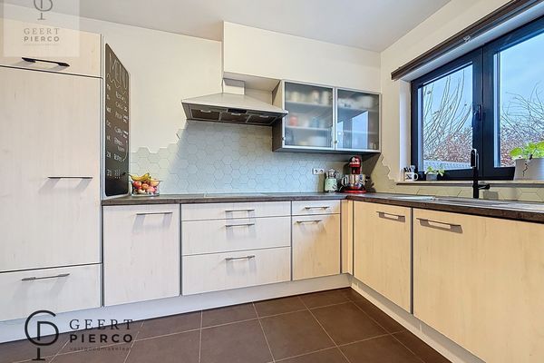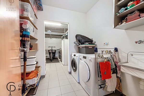 De open keuken met zicht naar de tuin heeft eveneens ook nog een aparte berging. Deze berging is perfect voor droog- en wasmachine, alsook de mogelijkheid tot het stockeren van extra spullen.