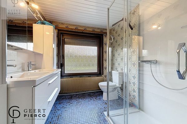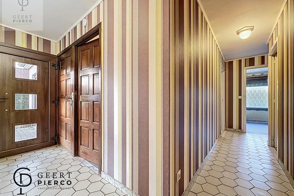 We betreden de woning via de voordeur en komen meteen in de inkomhal, die toegang biedt tot het aparte gastentoilet, de berging met doorgang naar de garage, de leefruimte, de drie slaapkamers en de badkamer. Alles bevindt zich netjes op het gelijkvloers, wat het wooncomfort alleen maar versterkt.