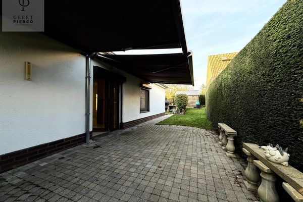 De leefruimte straalt gezelligheid uit en sluit mooi aan op de keuken. Via de keuken bereik je het terras, waar twee grote automatische luifels zorgen voor schaduw en comfort op zonnige dagen.