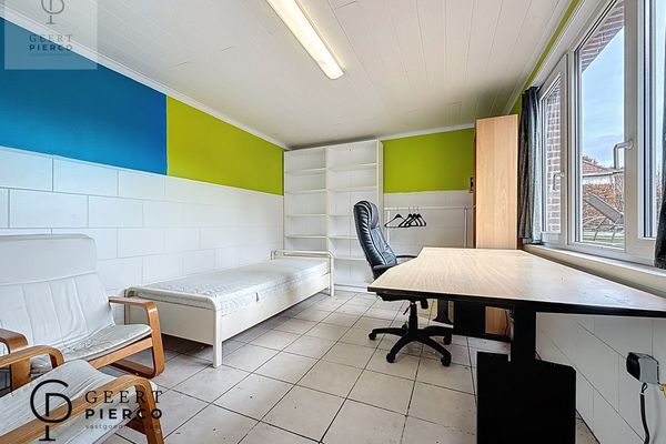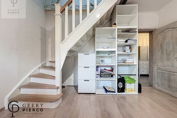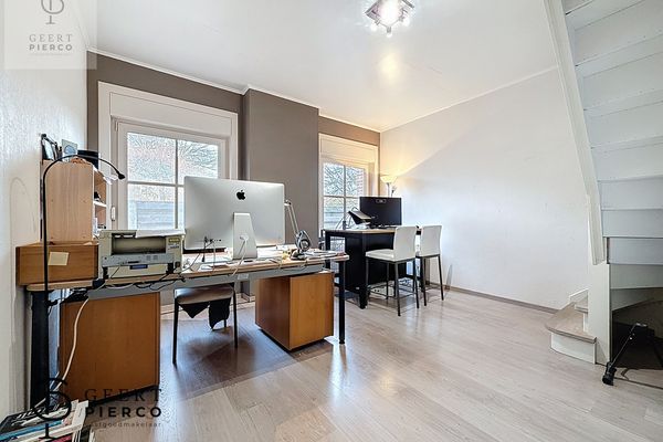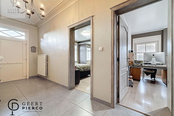 een kamer die vandaag wordt gebruikt als gelijkvloerse slaapkamer, een bureelruimte met trap naar de eerste verdieping, de badkamer op het gelijkvloers met bad, inloopdouche, toilet en lavabo, en tot slot de deur naar de leefruimte.