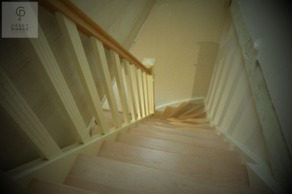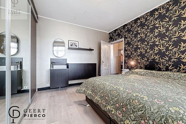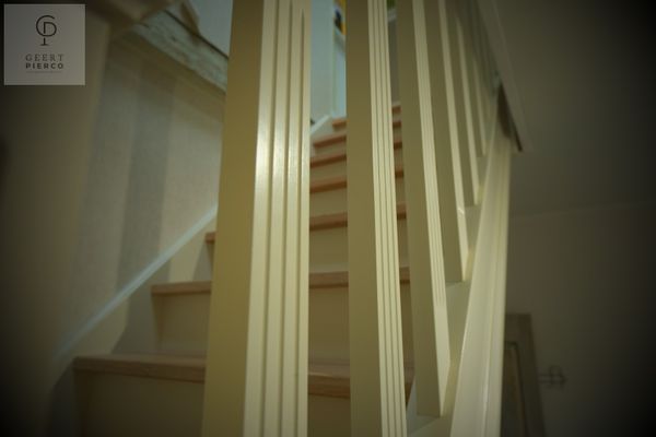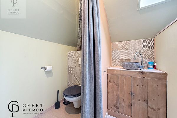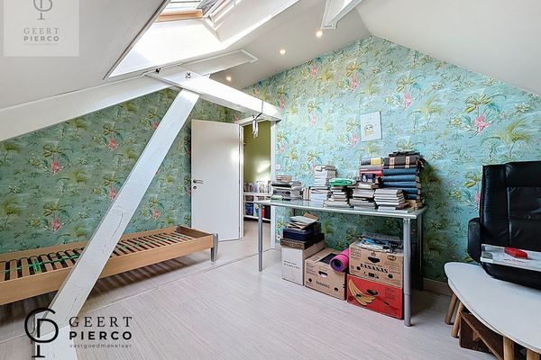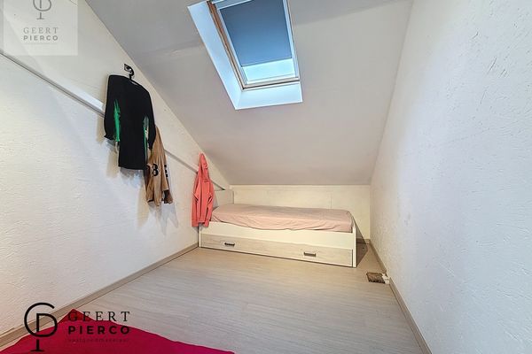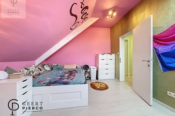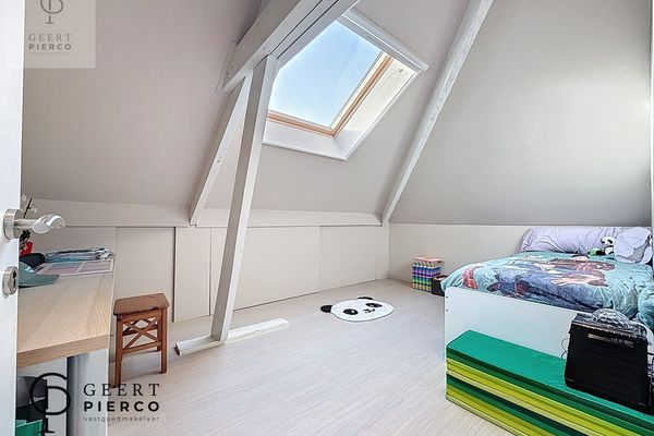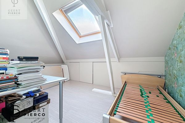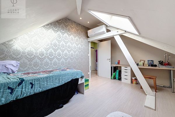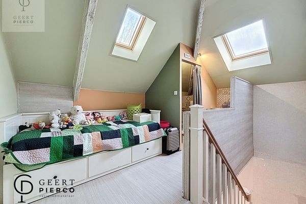 De eerste verdieping bevindt zich volledig onder het dak en wordt gekenmerkt door het zichtbare houten gebinte, wat dit verdiep extra karakter geeft. Hier vinden we vier slaapkamers en een apart toilet met lavabo.