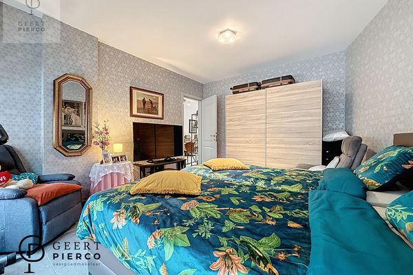 Verder beschikt het appartement over twee slaapkamers: een ruime kamer aan de straatzijde en een tweede, iets kleinere kamer achteraan, met rechtstreekse toegang tot het terras. Tussen beide kamers bevindt zich een praktische berging en een nette badkamer met douche.