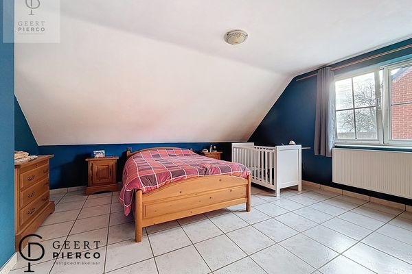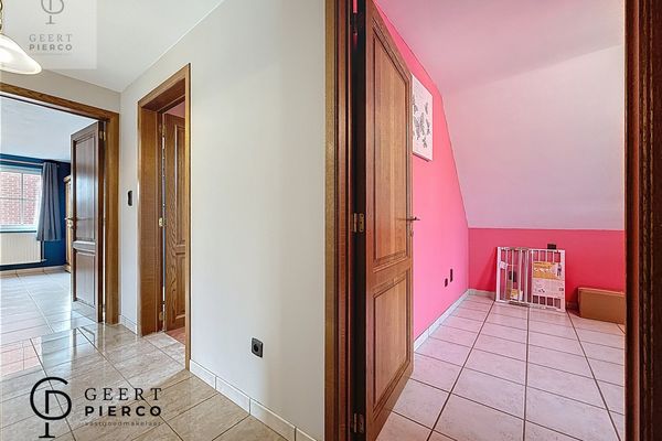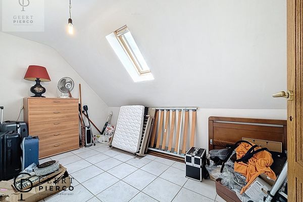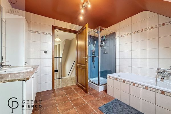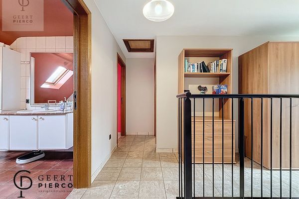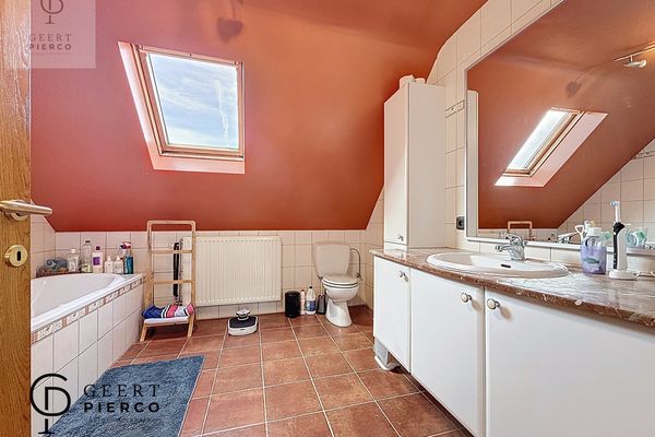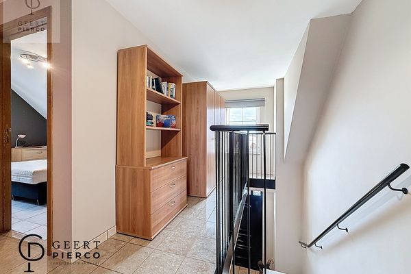 Op de eerste verdieping bevinden zich drie slaapkamers, waarvan één met een aparte dressing. Centraal tussen de kamers ligt de badkamer, uitgerust met een bad, douche, lavabo en een derde toilet.