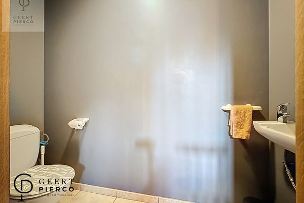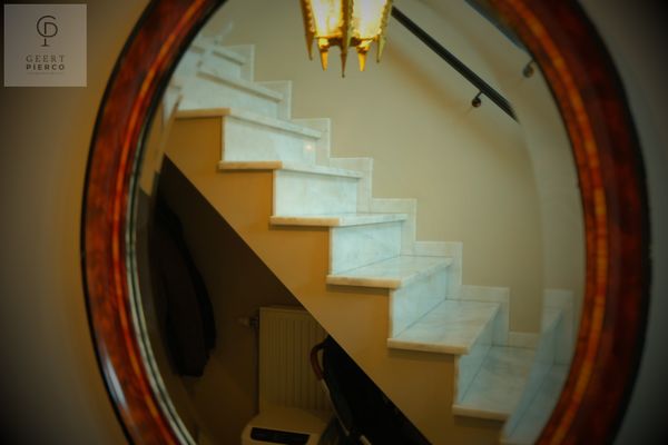 We betreden de woning via de voordeur en komen terecht in een ruime inkomhal met een apart en comfortabel gastentoilet. Onder de marmeren trap die naar het verdiep leidt, werd bijkomende opbergruimte voorzien — praktisch en discreet.