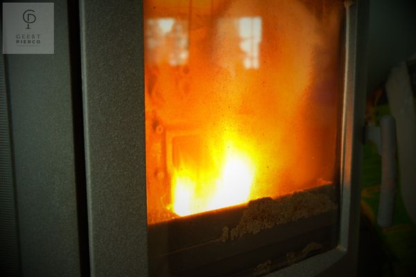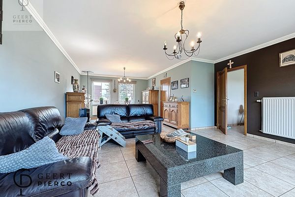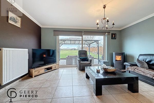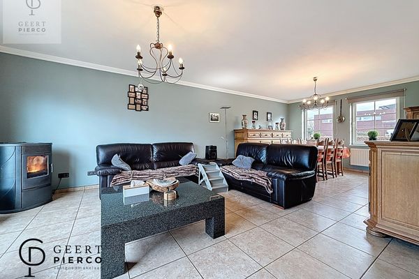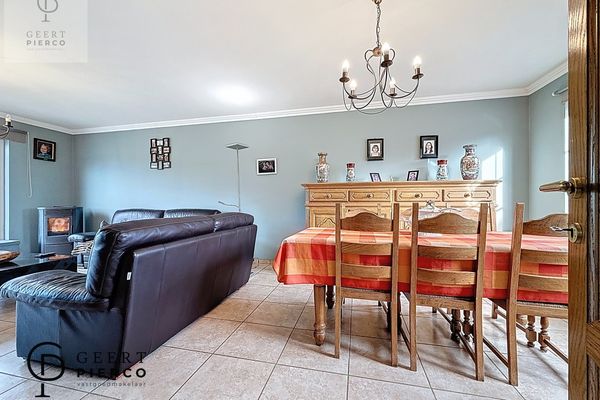 Aan de rechterzijde bevindt zich de lichtrijke leefruimte, een aangename en royale ruimte met grote raampartijen en een schuifraam dat uitkijkt op de indrukwekkende tuin. Hier nodigt een gezellige pelletkachel uit tot warme avonden en een huiselijk gevoel, waarbij de warmte zich aangenaam verspreidt over het gelijkvloers.