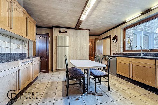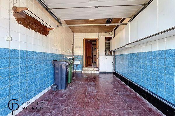 Aansluitend bevindt zich de afgesloten keuken, een ruime en praktische ruimte die eveneens toegang geeft tot de garage en een berging met douche.