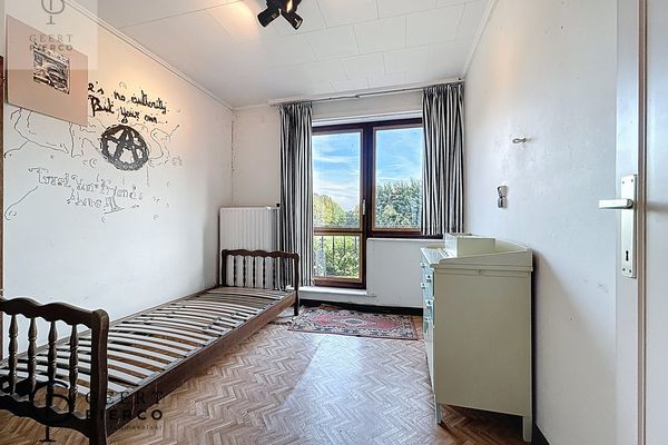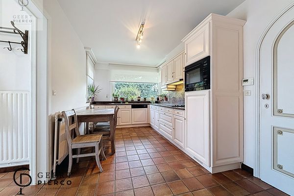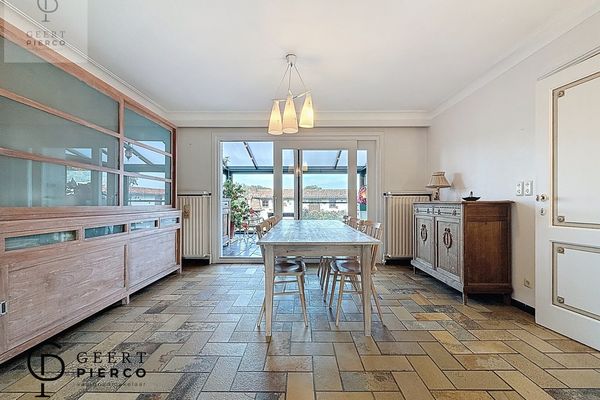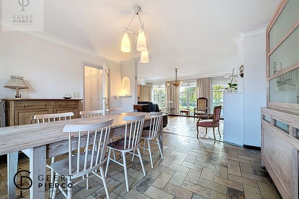 Aansluitend vinden we de eetruimte, die rechtstreeks overloopt in de veranda met uitzicht op de tuin. Deze lichte ruimte vormt een verlenging van de eetkamer en is de ideale plek om te genieten van een boek of een koffietje met zicht op het groen.