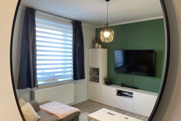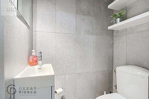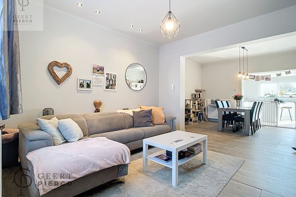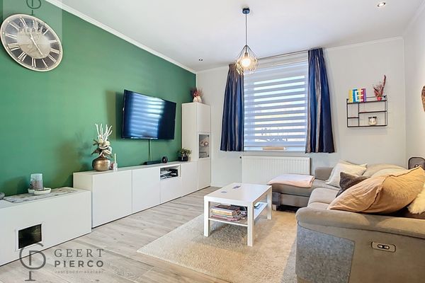 Op het gelijkvloers treffen we de ruime inkomhal, die verder toegang biedt tot het toilet, de gerenoveerde badkamer, de bovenverdieping en de leefruimte. Die leefruimte is netjes en gezellig ingericht en ook hier heb je meteen connectie met een super hypergeïnstalleerde keuken. Wauw.....